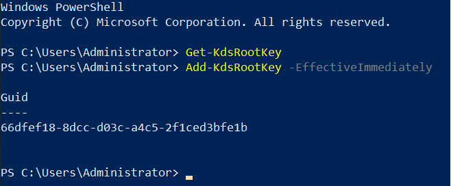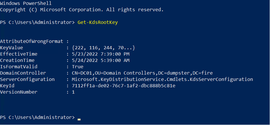 If there’s no result returned, the KDS Root Key has not been configured in the domain. Continue on to step 3. If there is a result returned, the KDS Root Key has already been configured in the domain. Skip step 3 and move on to Create the gMSA and password read group.